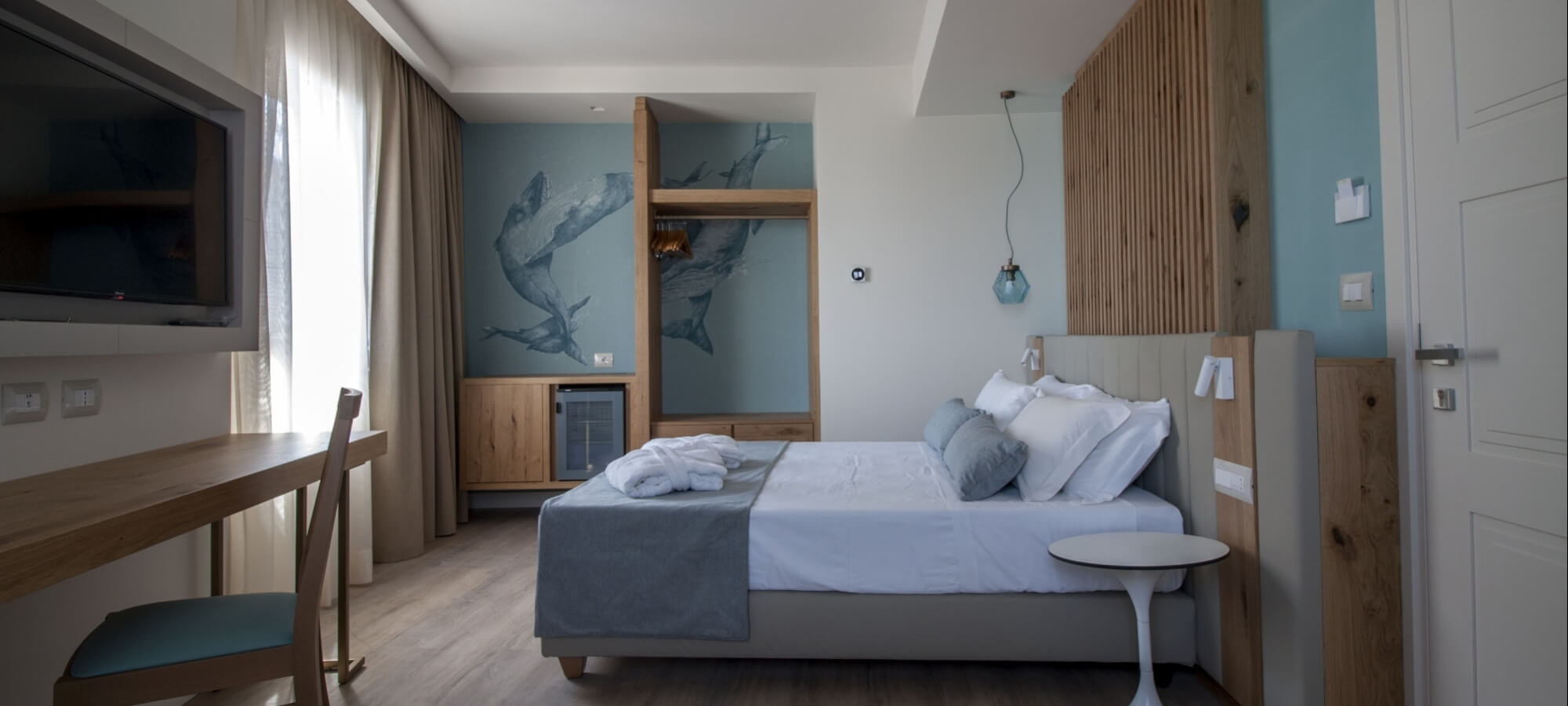 Ampie camere con letto matrimoniale che uniscono i comfort dell'Aqua Boutique Hotel al privilegio della vista sul mare e sul porto.